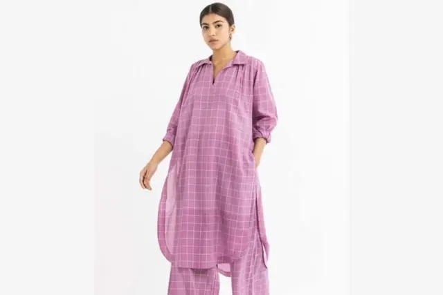 Model baju tunik setelan celana yang terakhir tampak begitu keren dan trendi. Sebab, setelan tersebut dibuat dengan bahan kain kotak-kotak warna ungu yang tampak nyaman. Untuk detailnya, tunik diberi aksen V-neck dan kerah tegak.